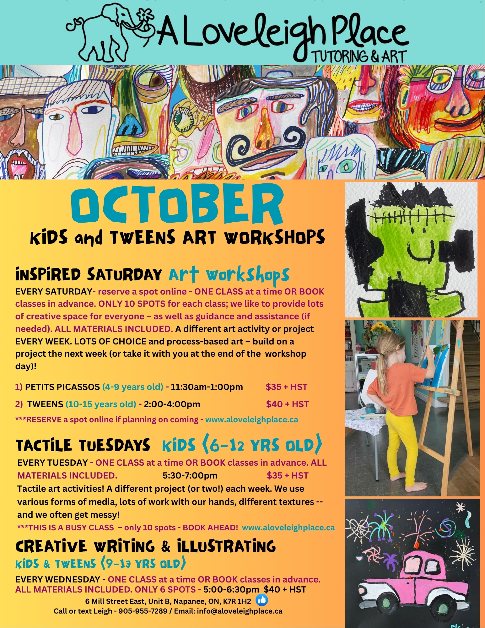 A different project every week! There are 10 spots per workshop. Always a process-based, age-appropriate project (or two) as choices for creators... OR always the option for young artists/creators to CHOOSE their own project with the wide variety of materials available at the studio! The cost is $35 + HST - ALL materials included.